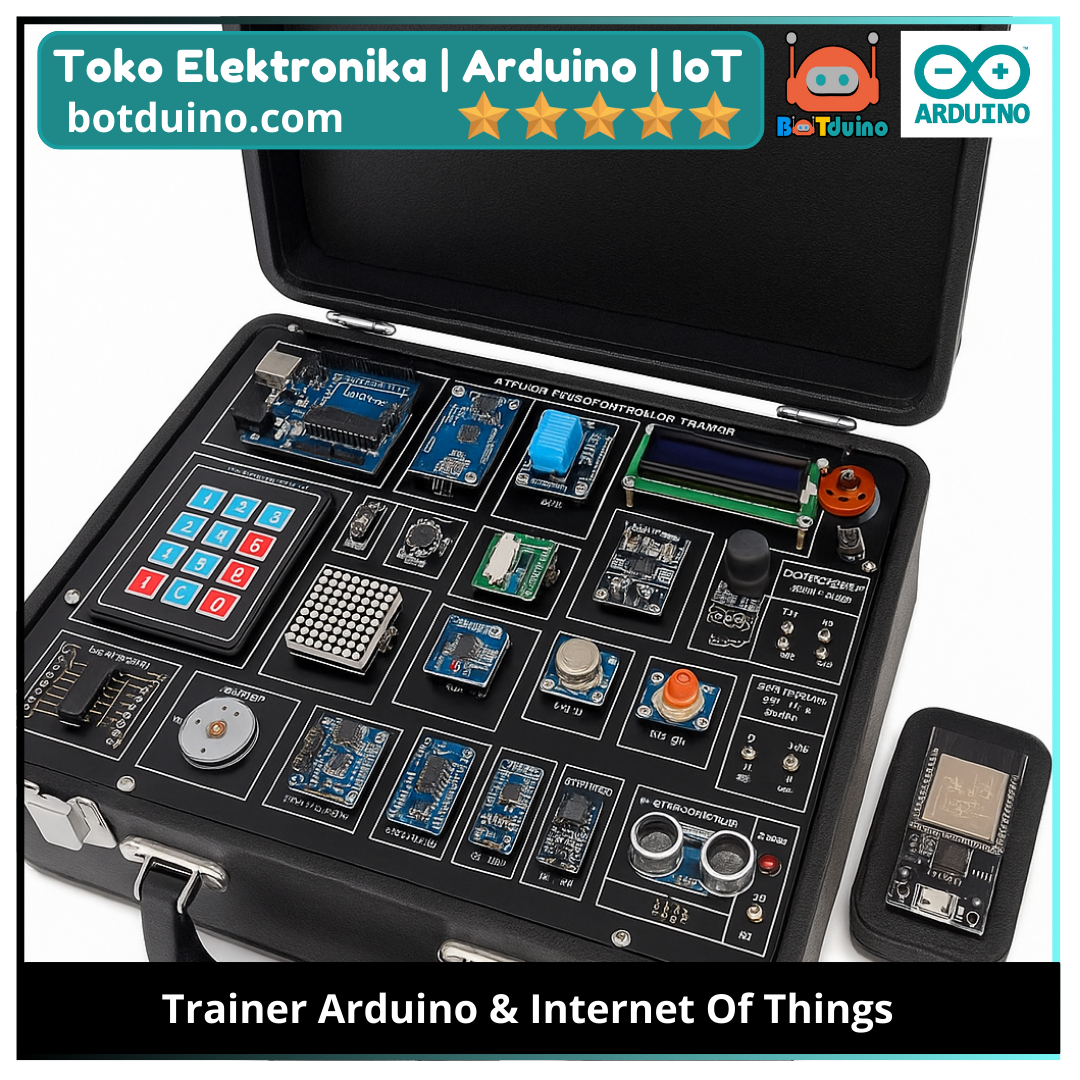 Trainer Arduino & IoT dari Botduino merupakan perangkat pembelajaran elektronik yang dirancang khusus untuk mengenalkan konsep pemrograman mikrokontroler, sensor, aktuator, dan sistem Internet of Things (IoT). Kit ini sangat cocok untuk siswa SMK, mahasiswa teknik, dosen, guru, dan para pengembang teknologi yang ingin belajar atau mengajarkan teknologi mikrokontroler dan IoT dengan metode praktikal.